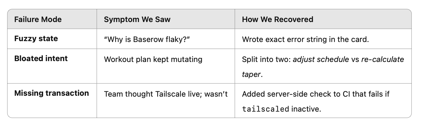 If you scroll our task management system right now, you’ll see cards that move effortlessly from Todo to Done and others that ricochet between columns. The difference isn’t man-hours; it’s whether each card honors the chain of State → Intent → Transaction.
