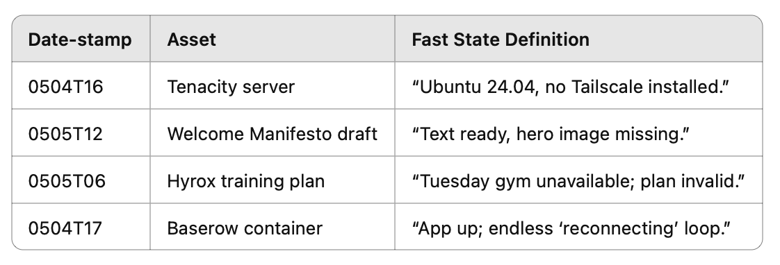 Label states in ≤ 7 words. Anything longer is storytelling.