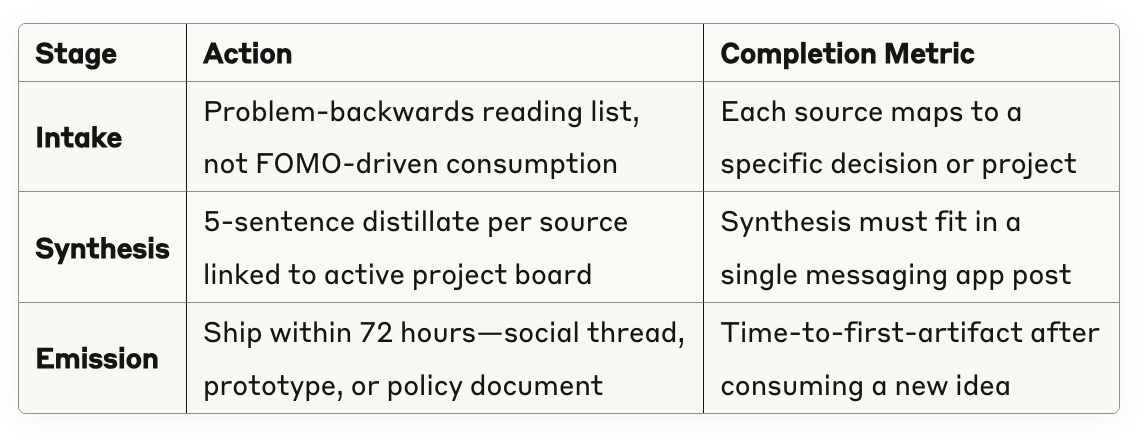 - Select the single highest-leverage idea from recent consumption and convert it to an artifact before EOD